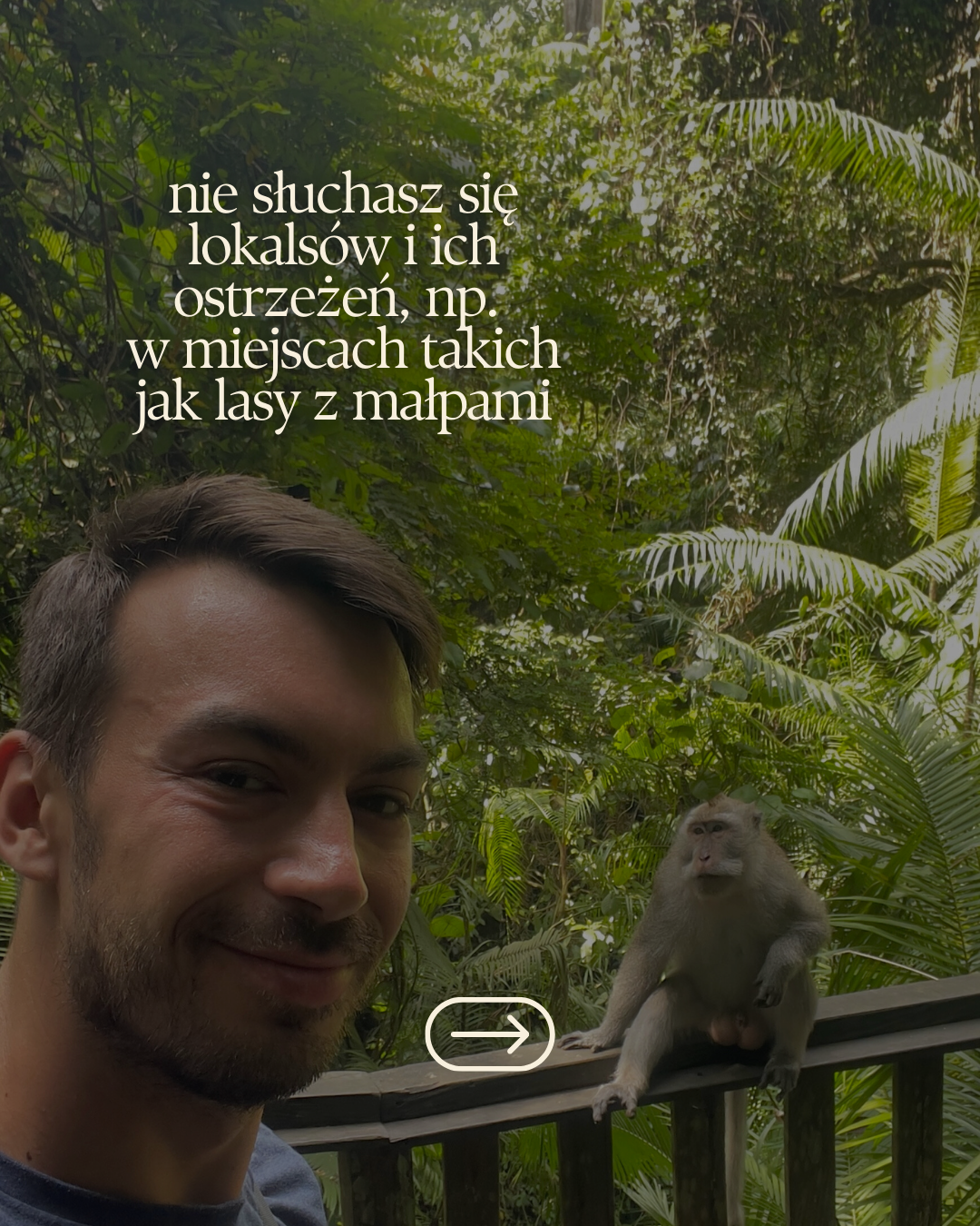 Kolejny bardzo ważny punkt to nie słuchanie się porad lokalsów. Trust me, jeśli mówią Ci "nie jeździj w klapkach, nie jeździj bez kasku, nie karm małp, schowaj telefon przy nich, zamknij torebkę, nie głaszcz ich" to rób to co Ci mówią. Chyba, że chcesz wylądować bez telefonu 10 tys. km od domu, albo bez paszportu, który Ci wyciągną z torby, albo ugryzą, więc kolejne kilka godzin spędzisz w szpitalu przyjmując szczepionki za setki dolarów (jeśli nie masz ubezpieczenia na przykład, a ubezpieczenie to must-have ZAWSZE!)